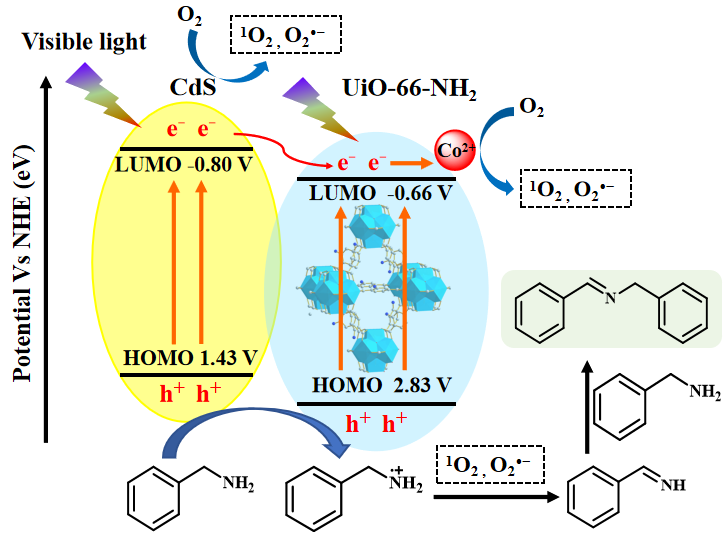 陈莲芬副教授团队针对这一难题,通过分步组装(SSA)策略,成功构建了一系列具有光敏性硫化镉纳米粒子和催化活性钴位点的多功能复合材料 CdS-x/UiO-66-IPy (Co)。该策略通过对UiO-66-NH2进行后合成共价修饰,引入潜在的金属螯合位点,不仅保证了小尺寸 CdS 在 UiO-66-NH2上的良好空间分布和精确定位,还在 MOF 结构中固定了丰富的活性钴位点,显著提高了光催化胺氧化性能。