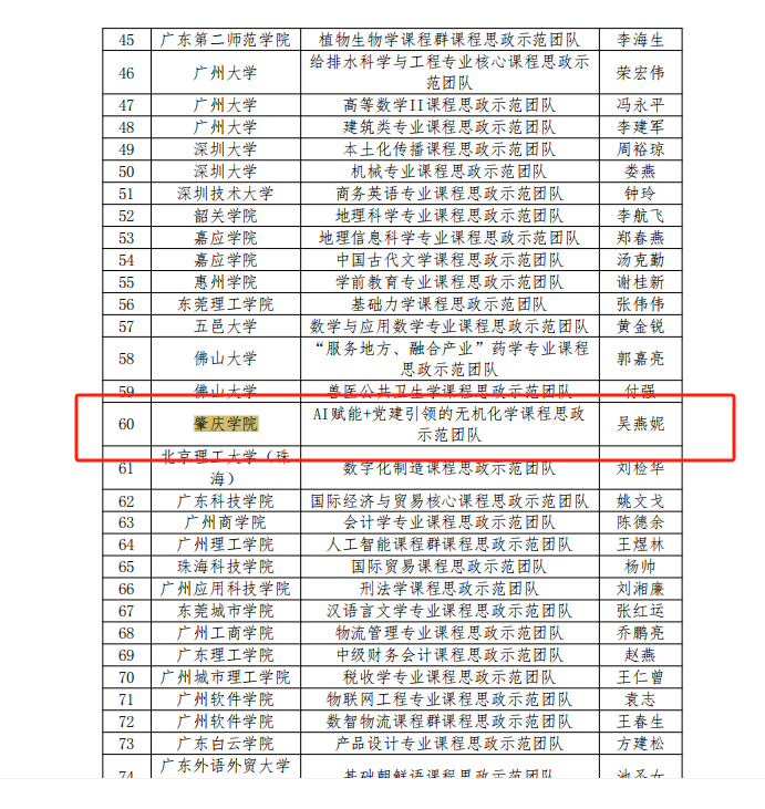 近日,广东省教育厅公布了2024年度本科高校课程思政改革示范项目认定名单,vsport官方网站吴燕妮教授带领的“AI赋能+党建引领的无机化学课程思政示范团队”在课程思政示范团队项目申报中脱颖而出,成功立项。
