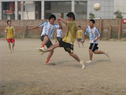 第二场是05代表队与08精化队之间的冠军争夺赛。随着一声哨响,比赛开始,场边啦啦队的尖叫声喝彩声此起彼伏。上半场05代表队的进攻成压倒趋势,屡次在精化队的门前制造险情,作为师弟的08精化队在05师兄们面前毫不示弱,奋力反攻。开场仅十分钟,精化队抓住一次反攻机会,3号钟利华直入禁区,一脚破门, 08精化队领队以领先一分的优势结束了上半场。下半场两队一直处于僵持状态。05代表队战术应用得当,凭借着扎实的脚下基本功,硬把精化队的进攻截断在禁区外。05代表队虽获得数个角球,却都被精化队的守门员稳稳抱入怀中或扑出。在下半场结束前五分钟,比赛进行到白热化阶段,代表队的10号郑新宏在禁区前用力抽射,球穿过防线,破门而入。1:1的平局一直持续到下半场结束。比赛最后,05代表队以5:4的总比分赢得冠军,08精化队获得第二名。