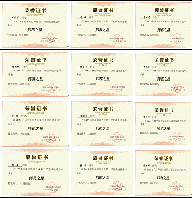 为表彰先进,树立典型,激励师范员工创先争优,根据2019级化学师范生大学四年期间“第二课堂”总成绩排名,经综合评选,何彩芬等12名同学被评为2023年vsport官方网站“师范之星”称号。