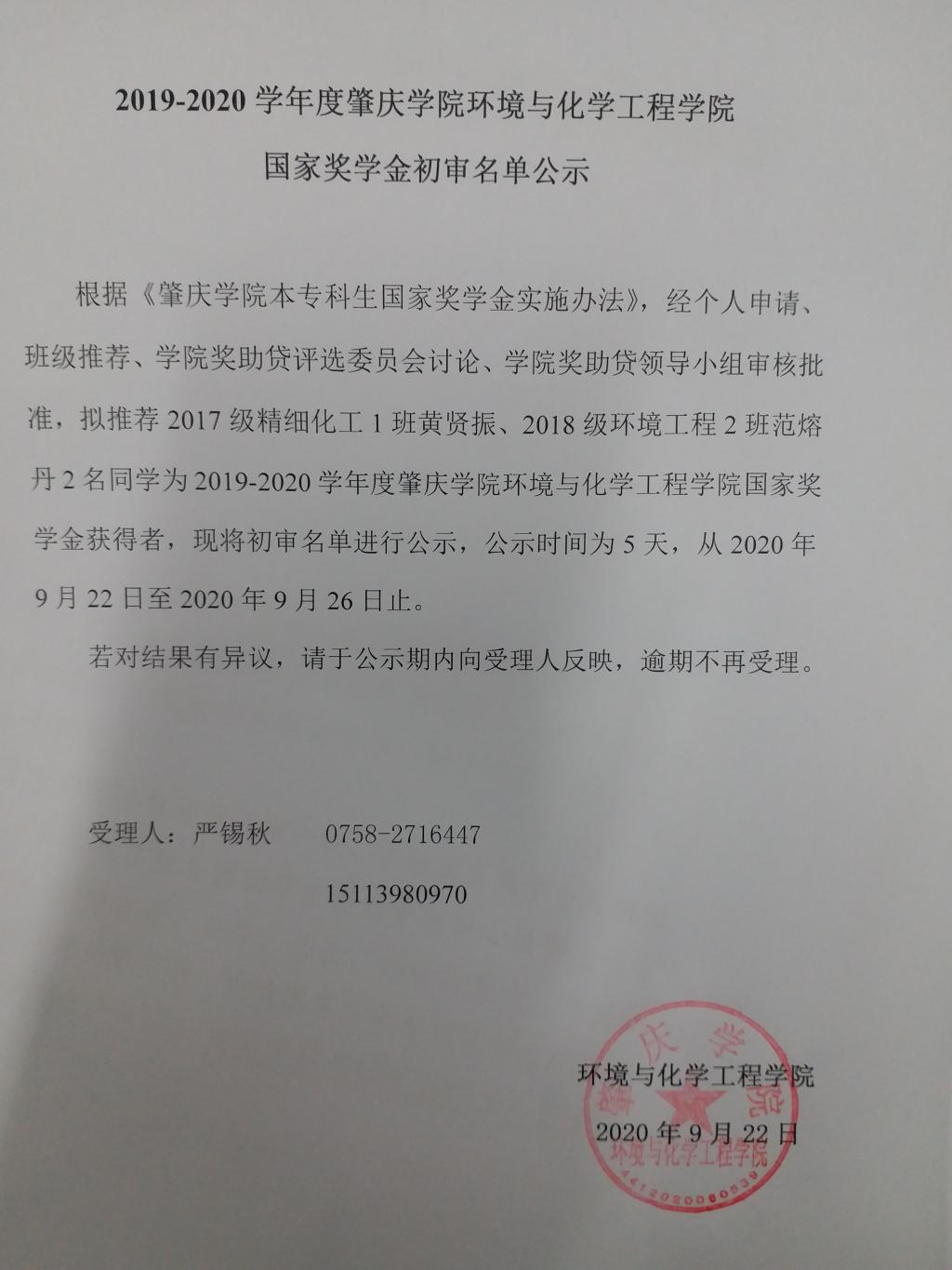 根据《vsport官方网站本专科生国家奖学金实施办法》,经个人申请、班级推荐、公司奖助贷评选委员会讨论、公司奖助贷领导小组审核批准,拟推荐2017级精细化工1班黄贤振、2018级环境工程2班范熔丹2名同学为2019-2020学年度vsport官方网站环境与化学工程公司国家奖学金获得者,现将初审名单进行公示,公示时间为5天,从2020年9月22日至2020年9月26日止。