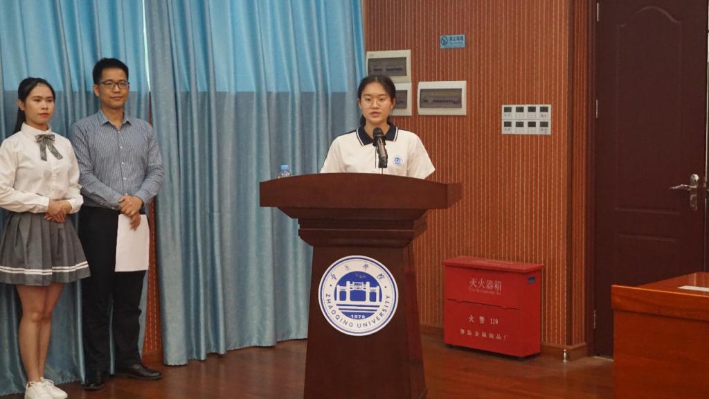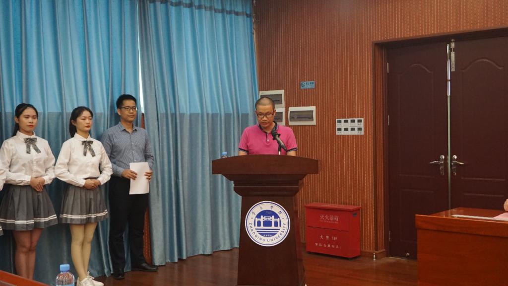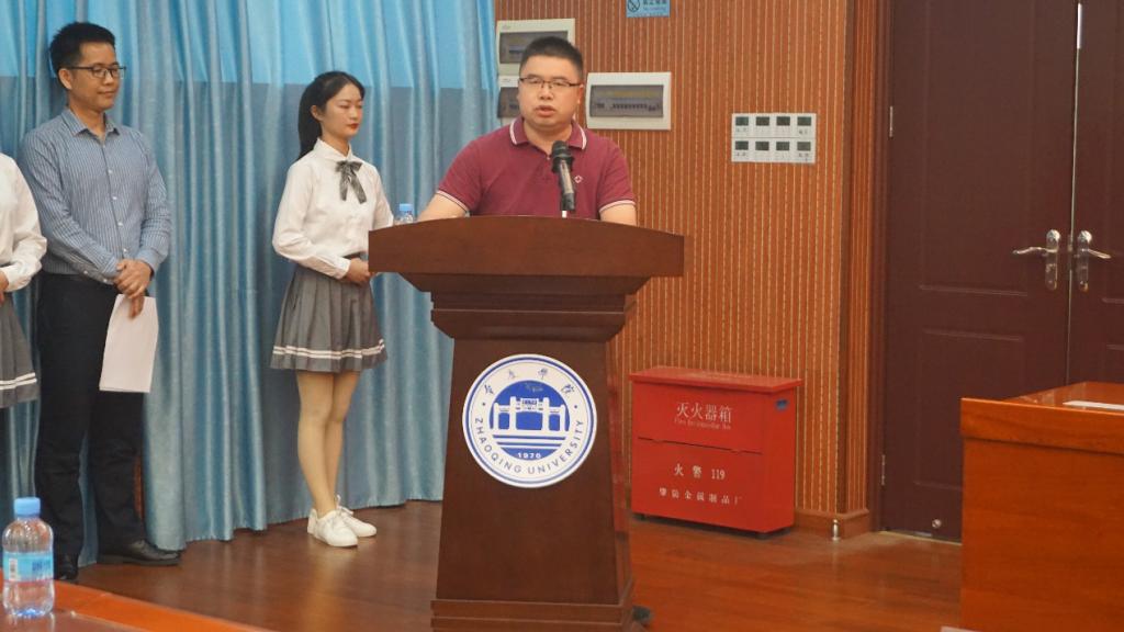 大会的第一项议程是肇庆市恒泰经济发展有限公司行政经理董世德发言。他简要的介绍了他所在的公司并且分享了公司设立奖学金的初心,鼓励员工成为团结、勤勉、奋进的肇院人。